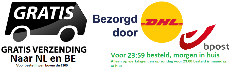 Bestellingen onder de €100,- betaald u €6,99 (€5,78 ex btw) voor het verzenden en wordt het verzonden via DHL/DPD of PostNL.